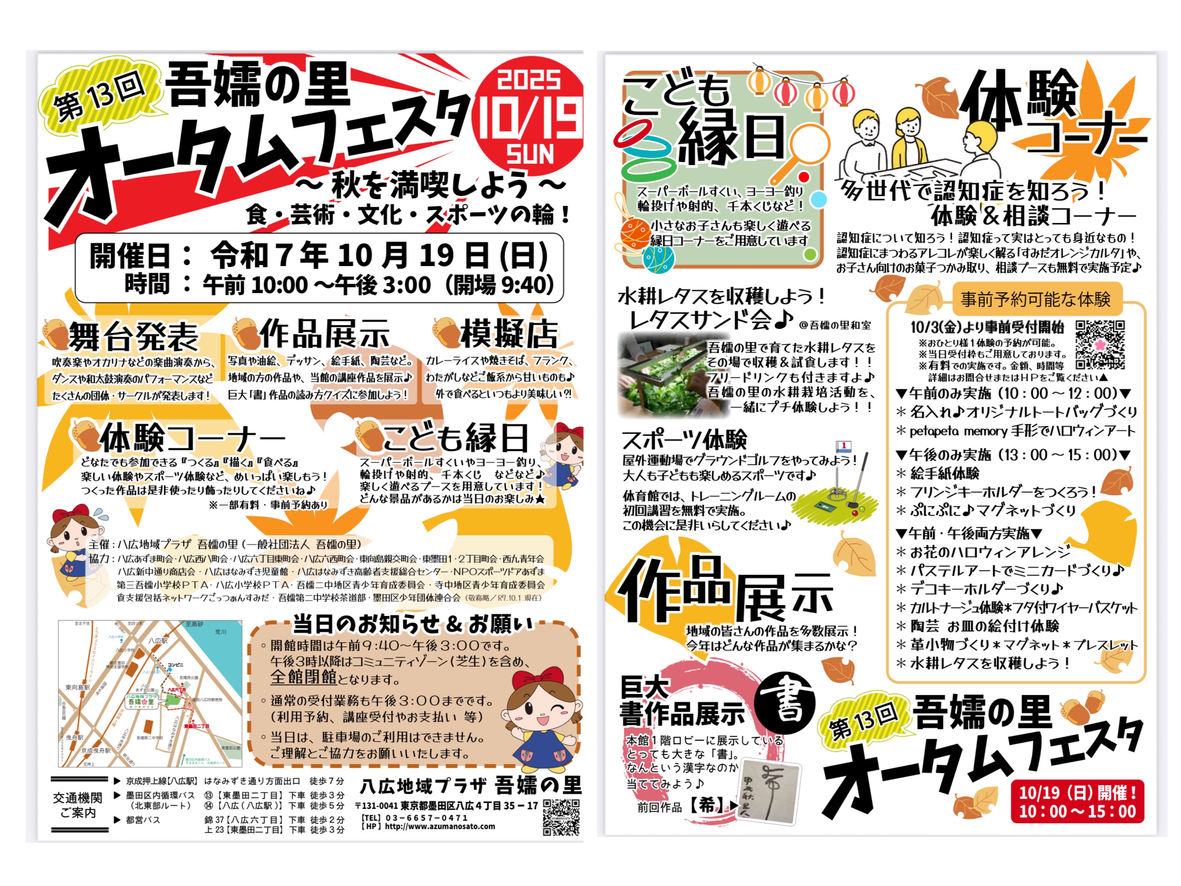 令和5年10月15日(日)に八広地域プラザ全館でオータムフェスタを開催いたします。当日は舞台発表、作品展示、体験コーナー、子どもコーナー、スポーツコーナー、模擬店、物産展等を実施する予定です。今年は八広地域プラザが開館して10周年の節目の年にあたりますので、感謝の気持ち込めていつもより盛りだくさんの内容で開催いたします。